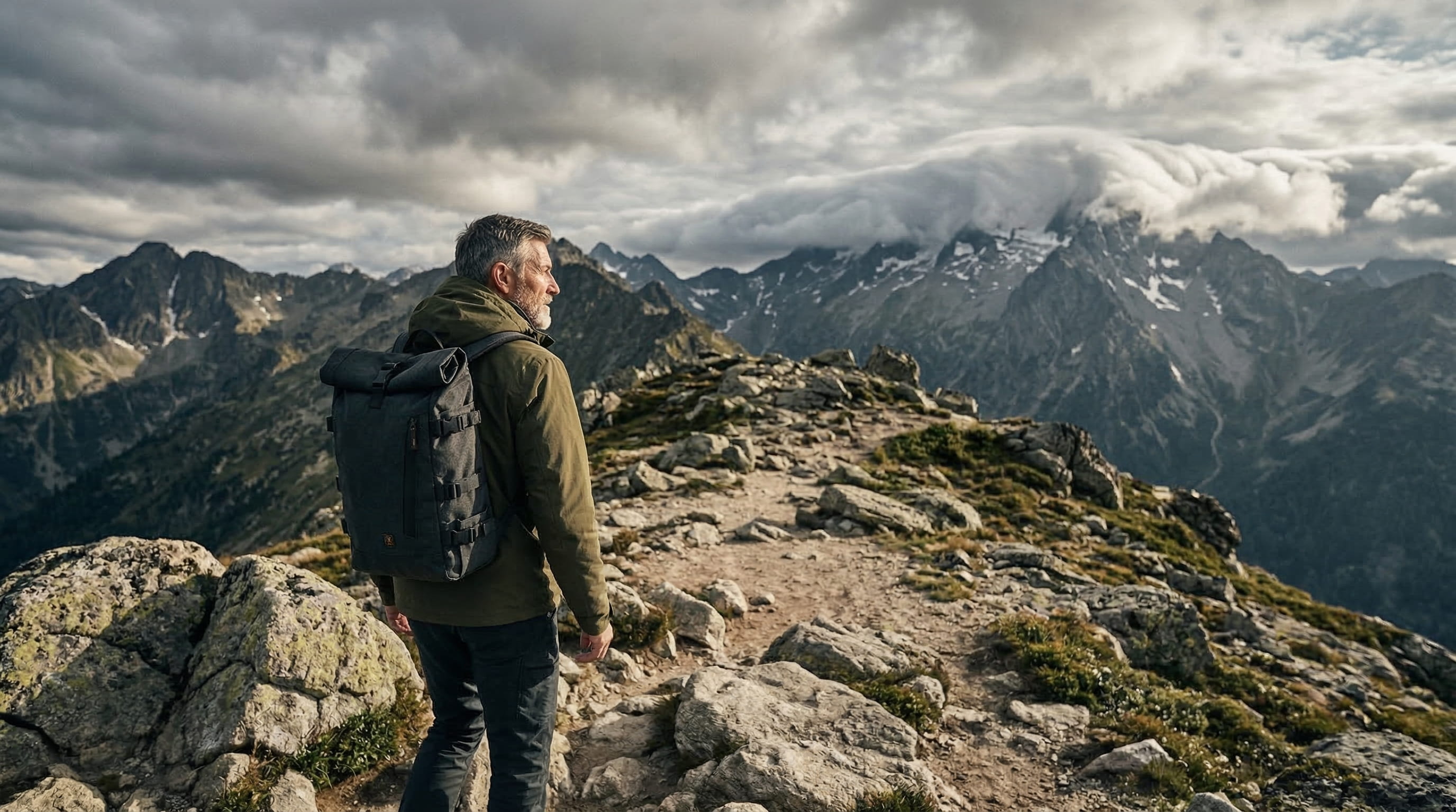 The model is mid-fifties, above the treeline, in weather that has not decided yet. No summit moment. No arrival. Just the particular confidence of someone who has crossed enough rivers to stop counting them.